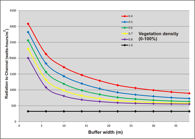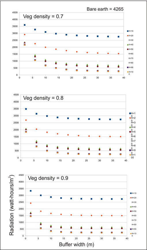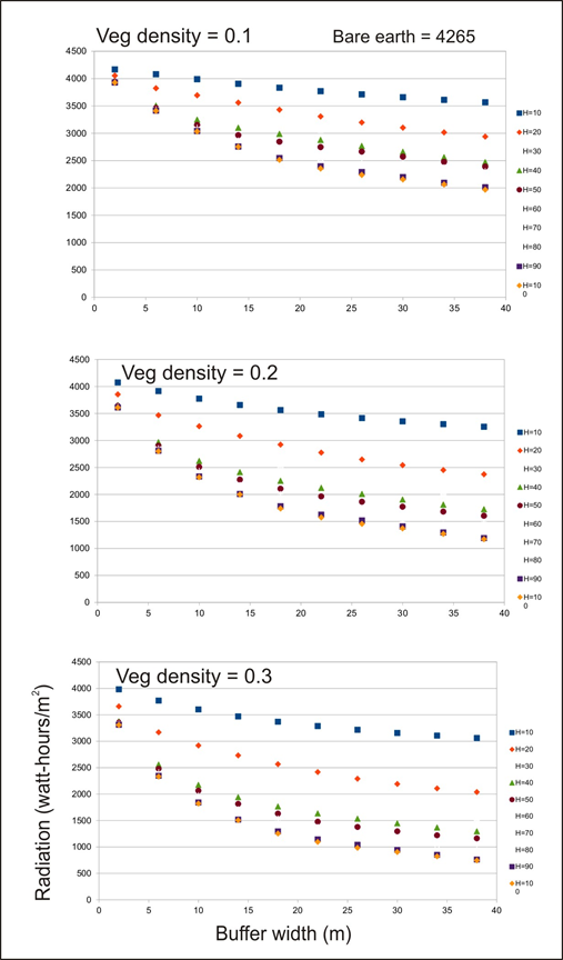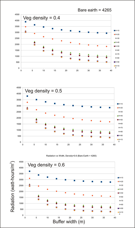 The numerous factors involved with predicting thermal loading or thermal sensitivity of individual streams (latitude, time of year, topographic shading, stream orientation, channel width, and vegetation height, width and density. It is informative to do a sensitivity analysis to observe how certain factors govern radiation loading. If we keep latitude, time of year (August), stream orientation (N-S), and channel width (10 m) constant, we can examine how vegetation height, buffer width and vegetation density affect thermal loading (these variables are important from a riparian management perspective, specifically the design and management of riparian forests, including buffer strips. See sensitivity analysis in Figures 5 through 7 below.