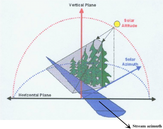 Figure 9. Thermal loading to the stream (watt-hours/m2) is affected by the solar azimuth, stream azimuth and solar altitude as well as vegetation shading. Figure modified from Boyd and Kasper (2003, 2007.