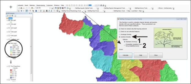Confluence density is generally calculated for all channels in a network. In NetMap’s density tool, a user first defines whether the analysis will occur on the total network or only on a subset of the network, defined by a previous attribute query (1, Figure 1). Next, the junction density can occur over the entire network or only the defined fish-bearing portion of the network (2, Figure 1). Junction density option is selected (3, Figure 1). If the density calculation is applied only to “selected” objects, then the junction density applies to channel segment-based attributes, such as channel gradient and valley widths, etc. In contrast, the density calculation can be applied only to confluence-based attributes (i.e., confluence probabilities or debris flow susceptibilities-junctions).
