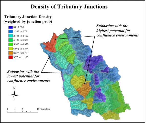 Tributary junctions can constitute areas of special geomorphic significance, including contributing to biological hotspots (see Confluence Environments in NetMap’s Fluvial Morphology Module). Variation in confluence density should translate to a corresponding variation in the density of channel junctions with implications for the degree of channel heterogeneity found in different landscapes (for additional background, see Benda et al. 2004,a,b among citations in the reference section). Thus, subbasin’s that have the highest junction density may also have significant biological potential and may even be more physically and perhaps biologically diverse, other things being equal.
