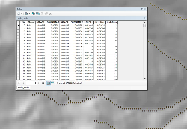Gradient [GRADIENT] is calculated using a moving window over the node network. The window length can either be fixed or variable (determined by drainage area). For example, one length scale can be specified above an area threshold and another length scale can be specified below an area threshold. This could be useful when identifying fish barriers that have a channel gradient threshold that is applied over different length scales depending on location in a basin. Consider fish passage barriers (for example, an 8% gradient for salmonids). A short section of 8% channel gradient (say 10 m) might be surmountable for fish passage. However, if the 8% gradient extended for a couple of hundred meters, that might pose a fish barrier. Maximum downstream gradient is calculated for each reach and stored as the [MAX_GRAD_D] attribute.