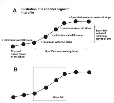 Figure 4. A waterfall is initiated when the node-to-node slope exceeds the WATERFALL MINIMUM SLOPE and the change in elevation over the upstream WINDOW LENGTH exceeds the WATERFALL MINIMUM ELEVATION. The waterfall flag continues until the node-to-node slope is less than the threshold and the elevation change over the upstream window is less than the elevation threshold and, if you included CHECK SLOPE, the maximum node-to-node slope over the upstream window is less than the slope threshold.