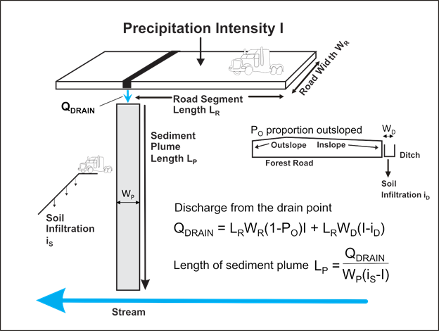 Figure 1. READI predicts road water runoff by multiplying road segment length by road width and rainfall intensity (m/yr) in units of m3/hr; the runoff can be adjusted by the proportion of road width outsloped. A water/sediment plume is