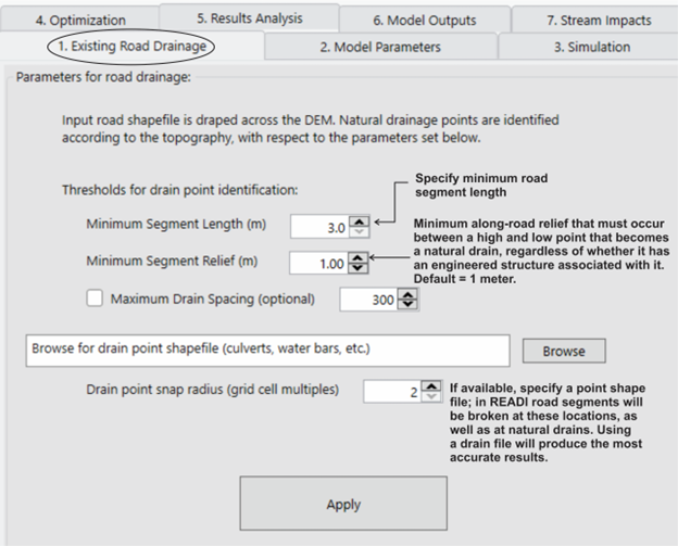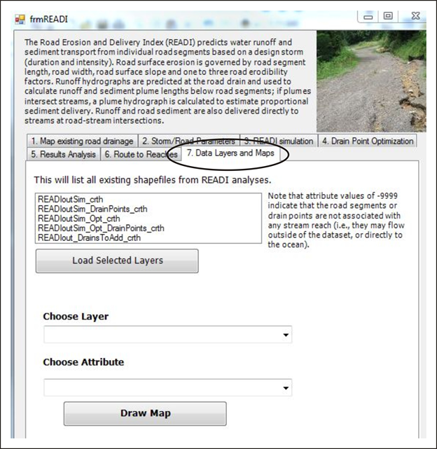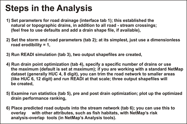 Additionally, READI includes an optimization component that is used to predict where additional road drains can be strategically placed to further disconnect road segments from streams and where road maintenance and upgrades can reduce sediment delivery. When using READI to predict location of new drains, one MUST consider the potential for the new drain runoff to trigger gullies, landslides and debris flows. See below for a description of READI in the context of slope stability.