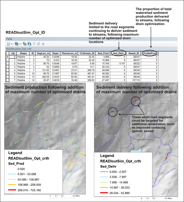 READIoutSim_ID = road layer (READI_ID) with output attributes including sediment production and sediment delivery to streams (see output ArcMap attribute tables below)