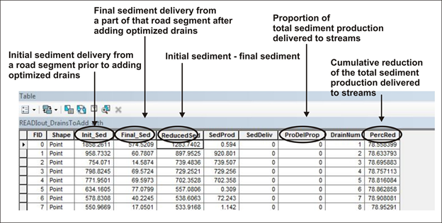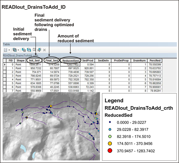 READIoutim_OPT_DrainPoints_ID = model output with attributes including sediment production and sediment delivery to streams (see output ArcMap attribute tables below)