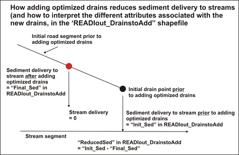 An analyst can use the attributes in the "drains to add" shapefile to prioritize placements of new drains to eliminate or reduce sediment delivery. See figures below.