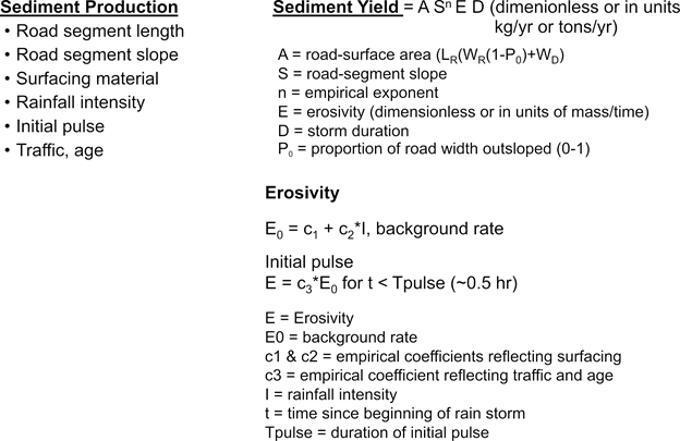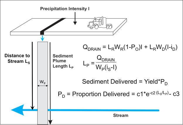 Delivery of sediment and water to a stream is dependent on calculated plume length. Water delivery is based on integration of a hydrograph at the base of the plume. Sediment delivery is calculated by integrating sediment production from the road surface multiplied by a delivered proportion that is a function of the ratio of distance-to-stream and plume length; PD = c1*EXP(-c2*(LS/LP)) + c3 (LS is distance to stream). It is assumed that if LS/LP < 1.0, PD = 0, and that PD cannot exceed 1.0. Supporting literature: Croke et al., 2005; Ketcheson and Megahan, 1996. The predicted distribution of plume lengths can be calibrated using field measured plume lengths.