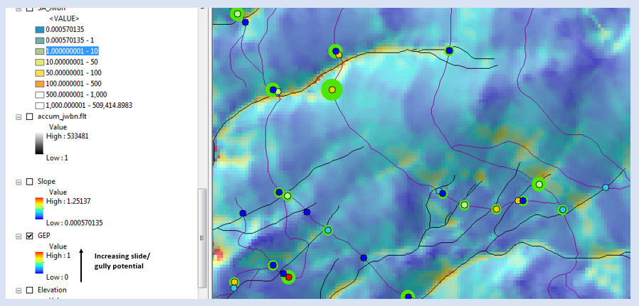 When considering placement of new drains, NetMap Generic Erosion Potential attribute should also be used, in conjunction with READI new drain attributes and the slope area product. See figure below.