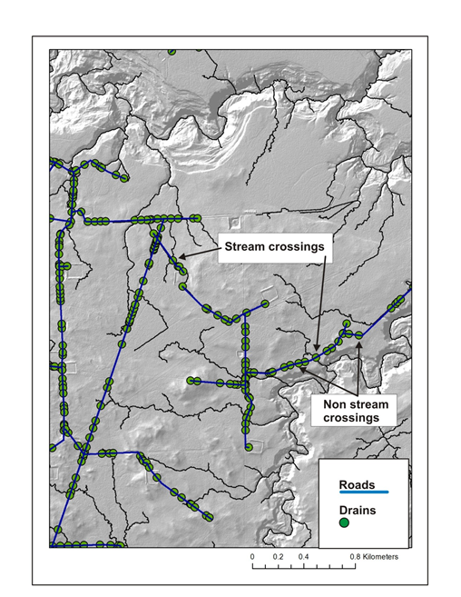 The road network (lines) is first broken at pixel cell boundaries. The individual, approximately pixel scale road cells, are then re-aggregated into hydrologically connected segments (tens to a hundreds of meters in length) that represent water flow paths from high (topographic) points to low (pour) points or to defined streams (see here). These hydrological road segments can be viewed in terms of their drainage diversion potential. For example, in the absence of secondary road drainage structures, the drainage diversion road segments should indicate the water diversion potential of any road segment, particularly under conditions such as during large storms or following wildfires.