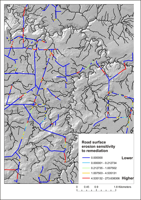 One can also prioritize where new road surfacing or other road surface erosion reduction strategies could be applied, and priortize them. For this exercise, it is best to create maps of predicted sediment delivery before or after calculating effects of adding new, optimized drains, and use those maps to identify those road segments with the highest predicted delivery. Then consider, based on the existing surfacing, whether upgrading surfacing, say from native to gravel, will reduce predicted sediment delivery. A map of prioritzation could be developed.