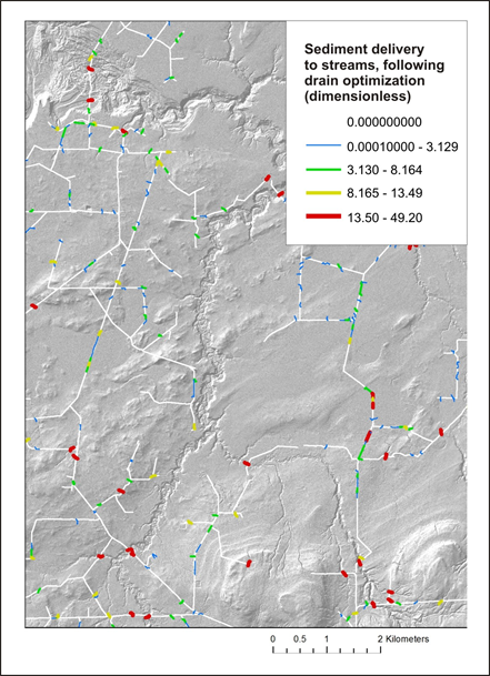 Figure. Optimized new road drain locations (added to natural Figure. Predicted sediment delivery following new drain optimization.